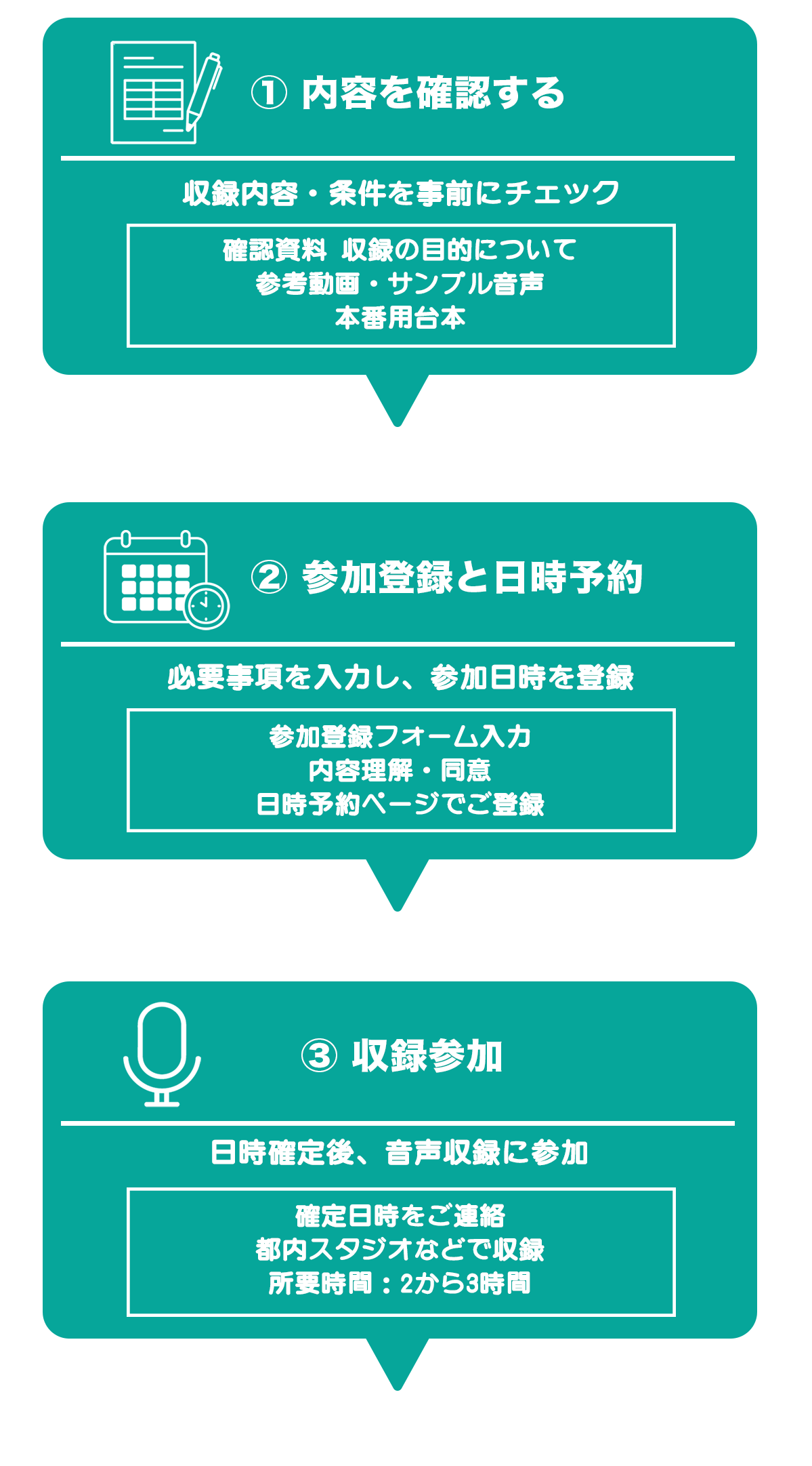 本プロジェクトは、音声のみを対象とした収録業務です。顔写真・映像の撮影は行いません。